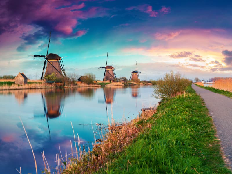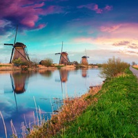 Kinderdijk, located just 25 kms. from Rotterdam is known worldwide for its 19 mills declared by UNESCO World Heritage Site offers a wonderful postcard images.Delft, Netherlands old town founded in the thirteenth century and known as the royal city. Inside the Nieuwe Kerk (New Church) is the pantheon of the Dutch Royal Family, he emphasizes his tower with 108.75 meters, the second highest in the Netherlands.
