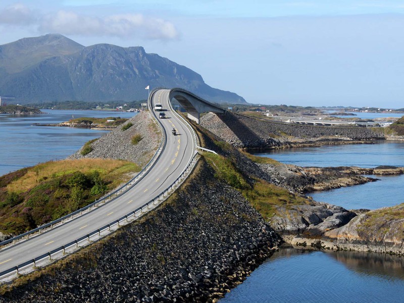 As we head toward the Atlantic Ocean Road, keep an eye out for seals, seabirds, and, if you're lucky, whales. This scenic stretch, one of Norway's National Tourist Routes, links islands and reefs while winding from the island of Averøy to the mainland. The Atlantic Ocean Road zigzags over bridges from island to island, right on the ocean's edge. Covering 8.2 kilometers, it crosses a total of eight bridges and traverses stunning coastal scenery. It is one of Norway's most visited tourist destinations and won the "Engineering Feat of the Century" award in 2005.