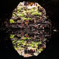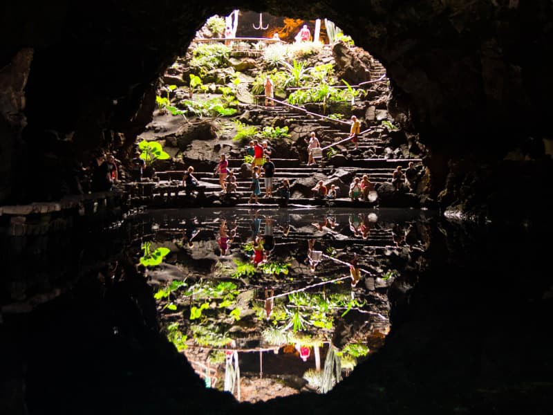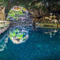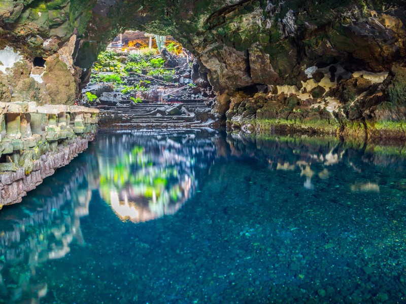 Passing close to the Mount Corona Volcano surrounding the area we arrive at the Jameos del Agua. This is a natural cave formed by volcanic activity from the Mount Corona and more recently styled by César Manrique – an attraction of undeniable beauty, also featuring a lagoon with blind white crabs, swimming pool, auditorium, seismology room, restaurant and bars.