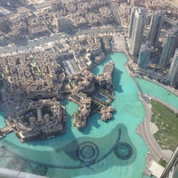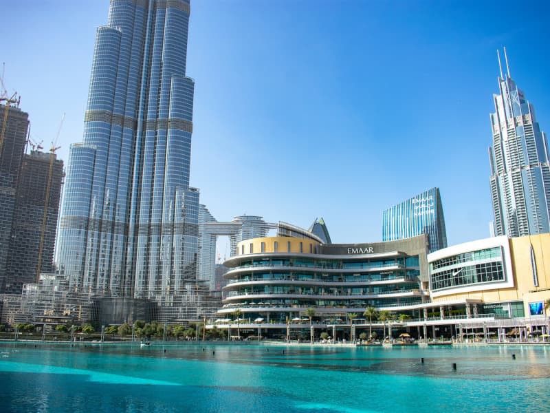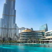 At one of the entrances to Dubai Mall is the Burj Khalifa, the tallest building in the world. In front of the building, you can find the lake and the Dubai Fountain.